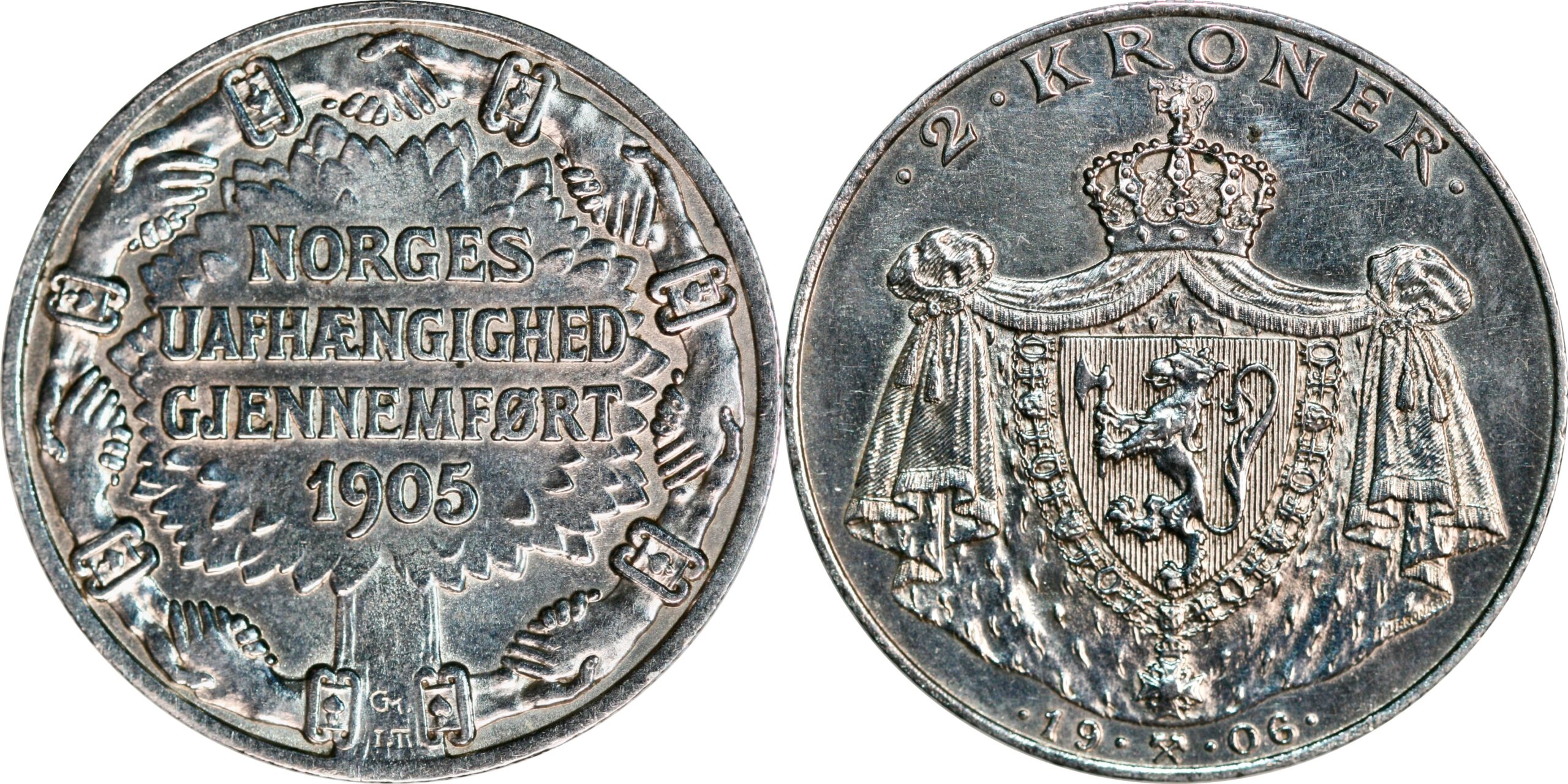 2 kroner fra 1906, slått under kong Haakon VII. Kv. 01. NM 3; KM 363. 15,0 g.