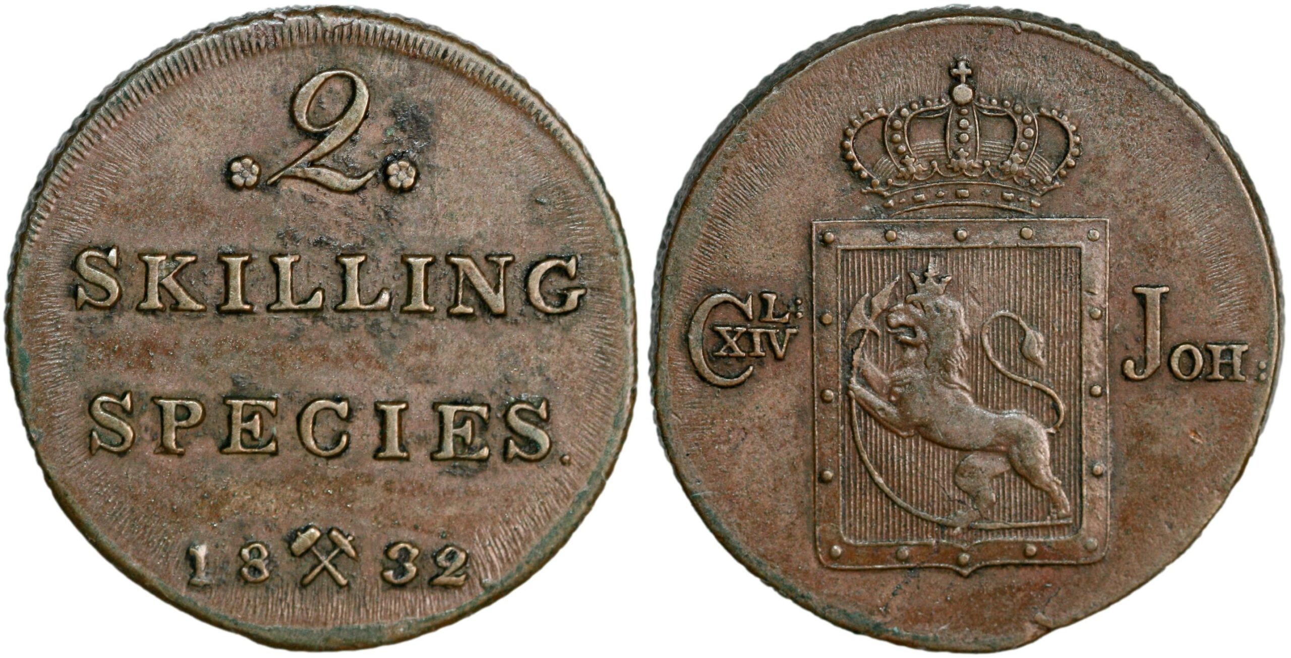 2 skilling fra 1832, slått under kong Carl XIV Johan. Kv. 1+/01. Svært høy relieff for denne mynttypen, og vakre flytlinjer i metallet. NM 55; KM 295. 19,16 g.