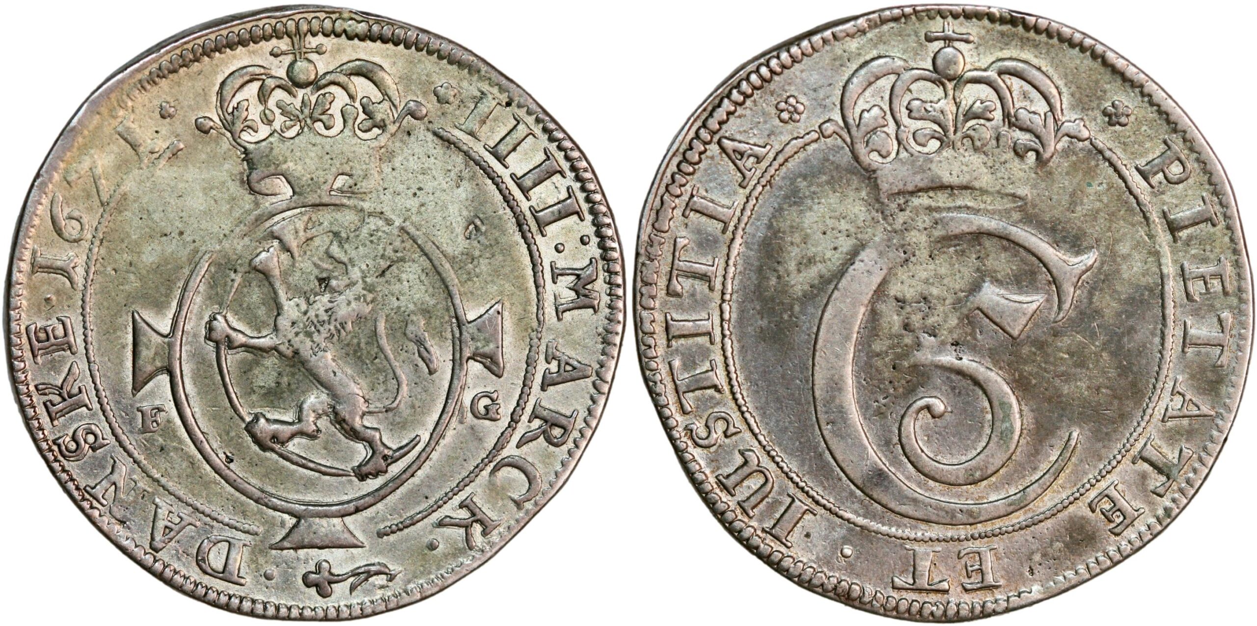 4 mark fra 1671, slått under kong Christian V. Kv. 1/1+. NMD 77A; KM 96; Dav. 3662; S. 30; H 41B. 20,92 g.