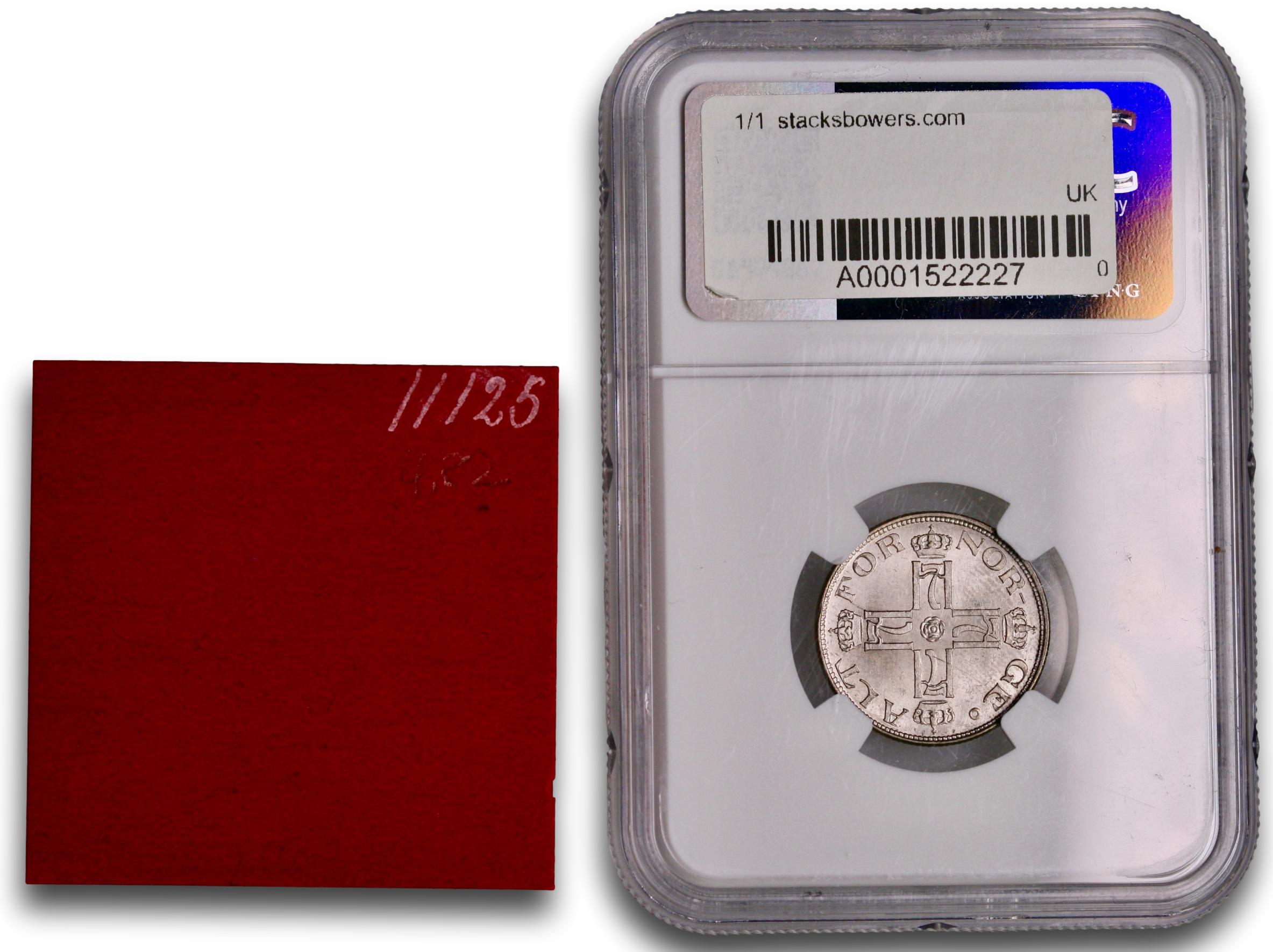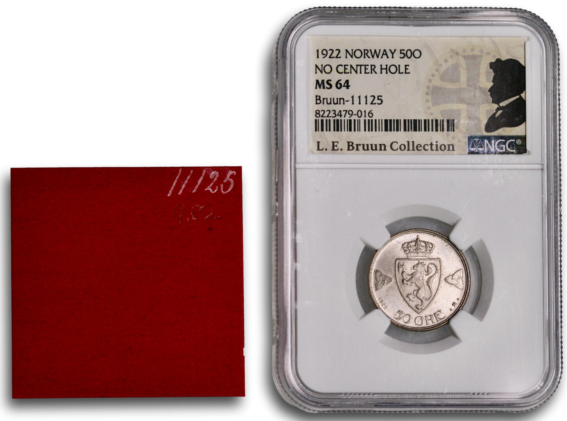 50 øre fra 1922, slått under kong Haakon VII. Innkapslet av Numismatic Guaranty Company og gradert MS64. NM 55. Ex. Lars Emil Bruun (1852-1923). 4,8 g.