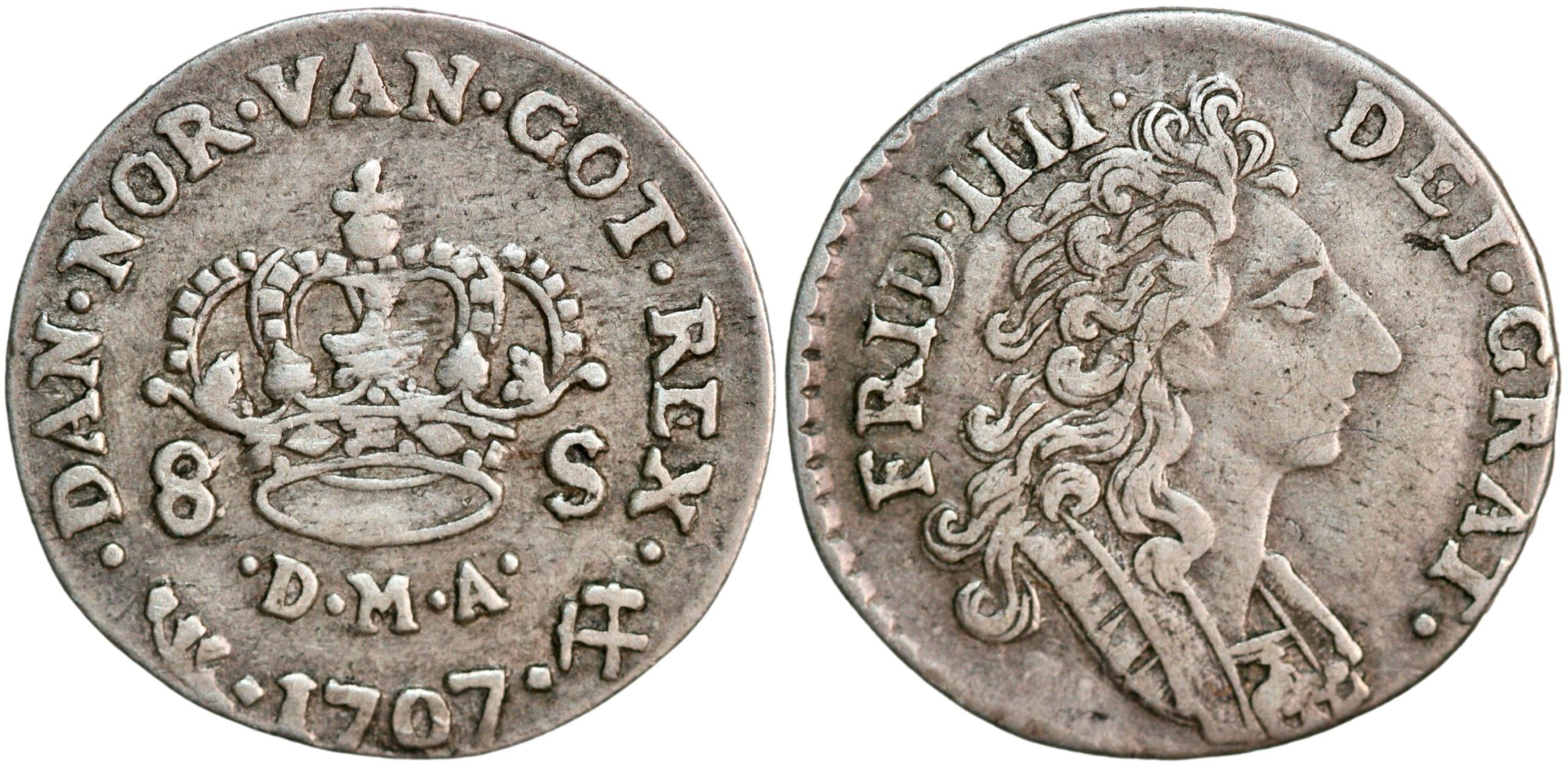 8 skilling fra 1707, slått under kong Frederik IV. Kv. 1/1+. NMD 30; KM 209; S 3.2; H 6B. 2,21 g.