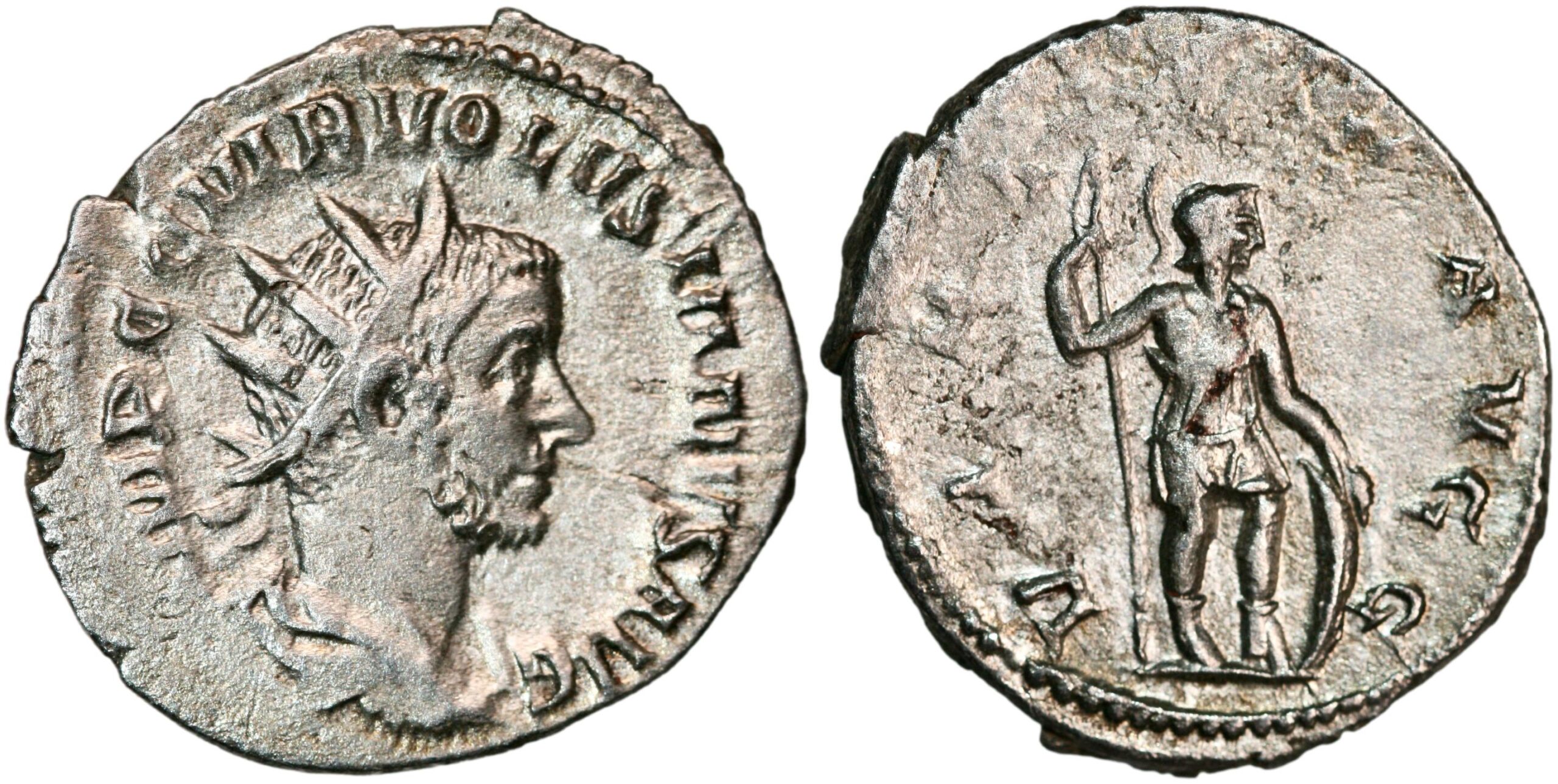Antoninianus dated 251-253 e. Kr., slått under keiser Volusian. Milano myntsted. Byste med strålekrone, drapering og brystharnisk mot høyre / Virtus stående mot høyre, med spyd i høyre hånd og venstre hånd hvilende på skjold foran. RIC 206; RSC 133; Sear 9776. 3,08 g.