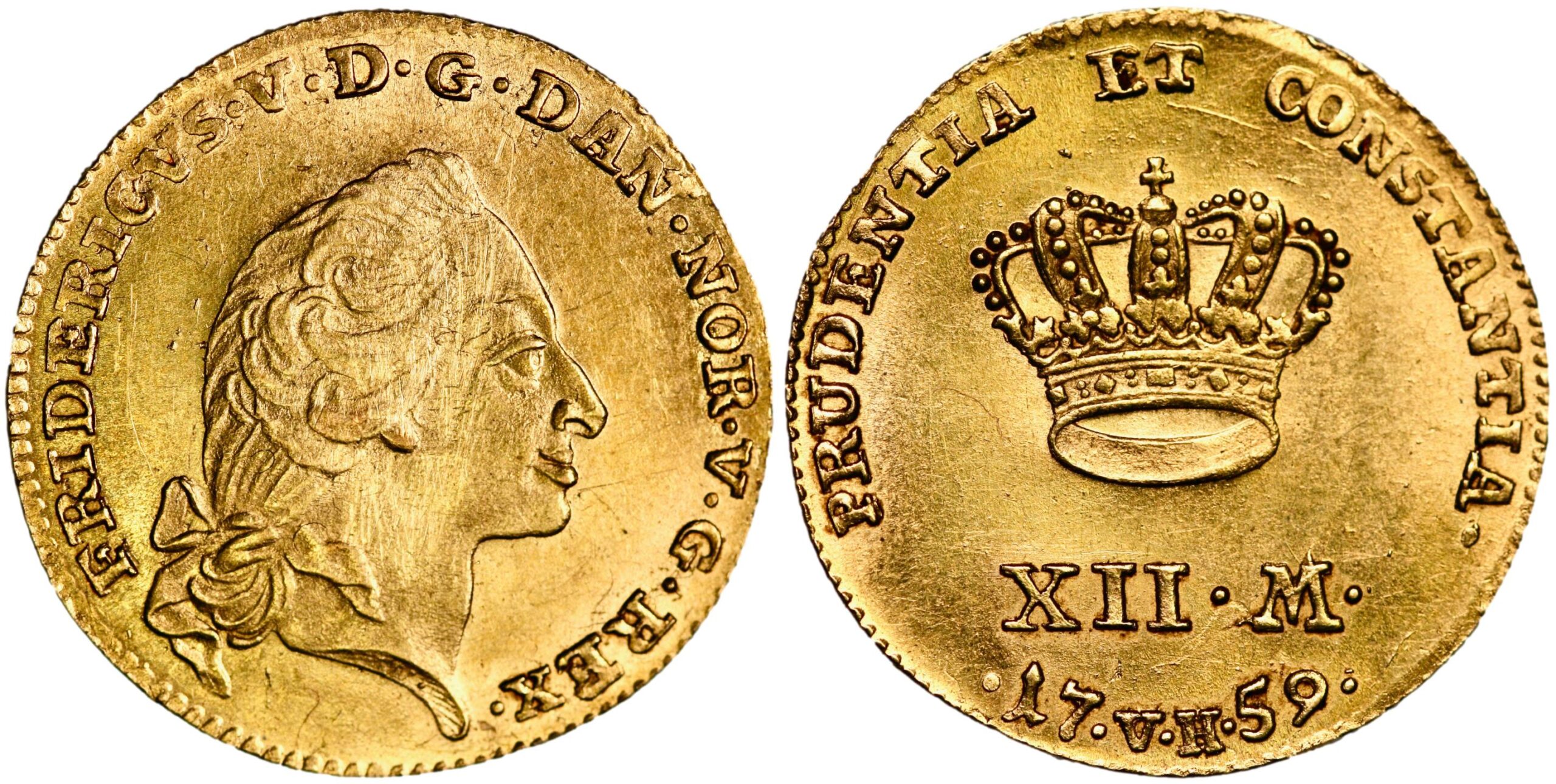 Danmark, kurantdukat (gull!) fra 1759, slått under kong Frederik V. Kv. 0/01. Ubetydelige hairlines på bysten. Eksepsjonell kvalitet for denne mynttypen. S. 21.3; H 22C; Fr. 269; KM 587.3. 3,12 g.