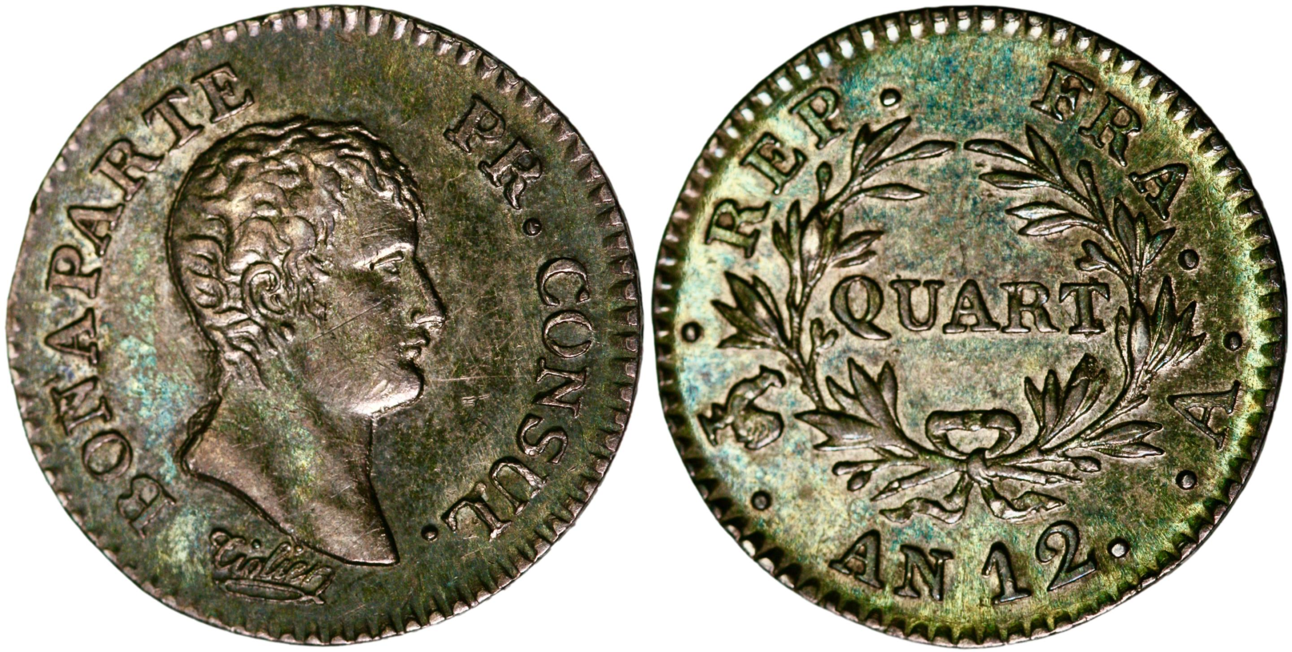 Frankrike, 1/4 franc fra 1803 (AN 12), slått under keiser Napoleon. Paris (A) myntsted. Kv. 0. Vakker patina. Gadoury 342; KM# 653.1. 2,46 g.