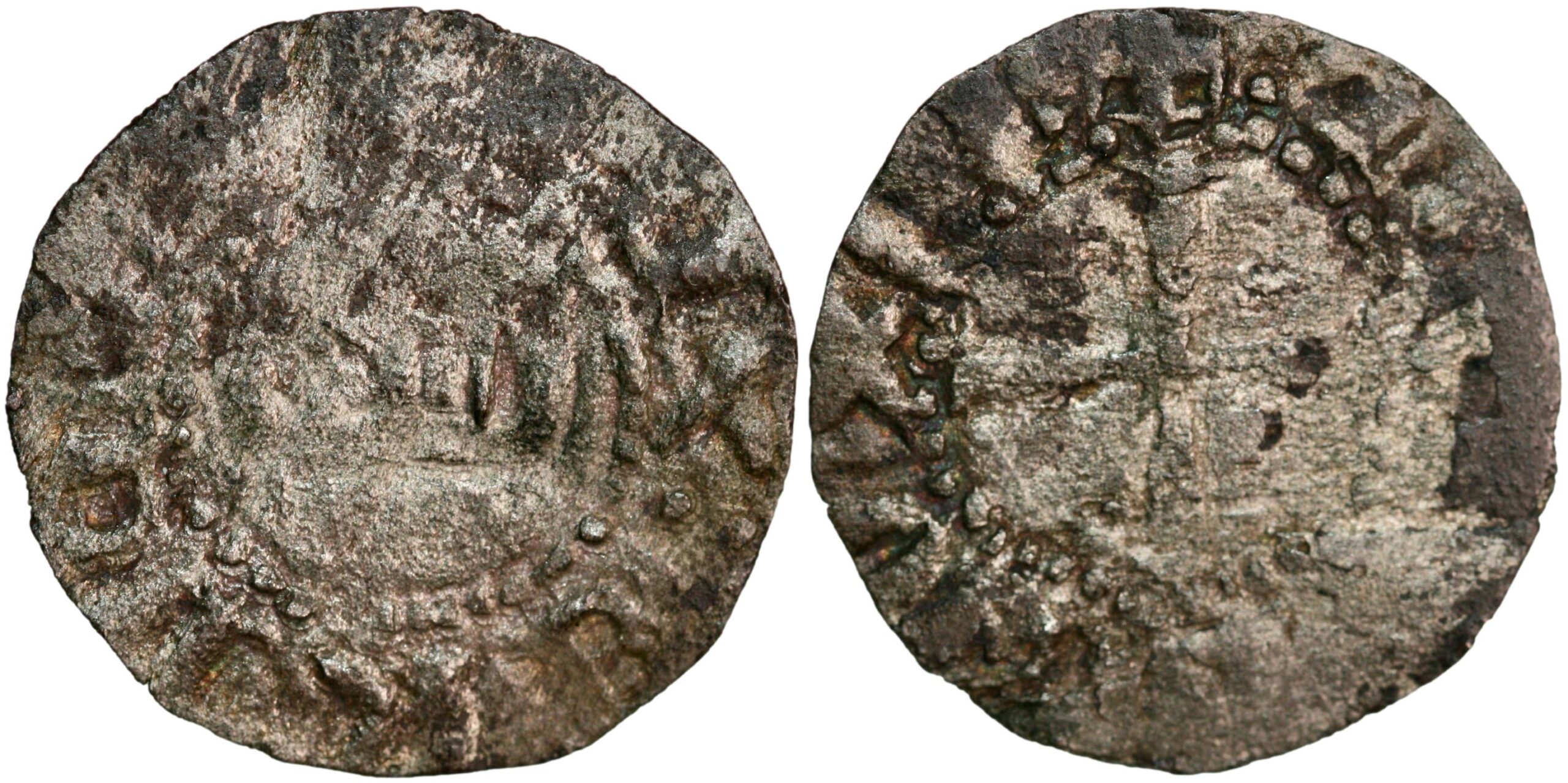 Penning (“Nigri Coronati”), fra 1280–1299. Kv. 1, med spor av korrosjon. Et godt eksemplar av typen. Angivelig eksportert fra Norge til Sverige, med eksporttillatelse utstedt av norske myndigheter i 2023. Mynten stammer fra Alstad-funnet (Toten sogn), gravd ut i 1820. Schive IX:42; NM 2. 0,57 g.