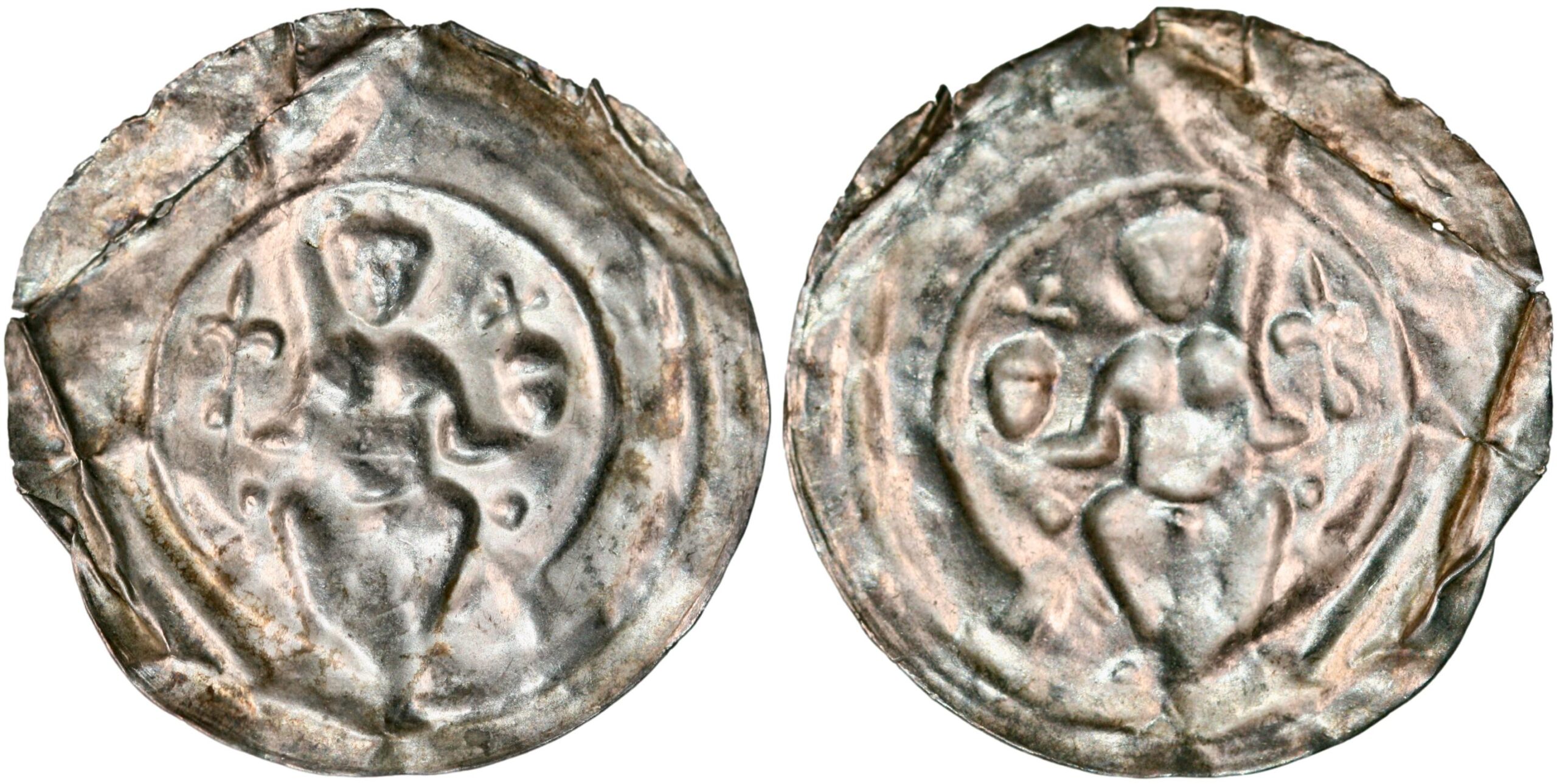 Tyskland, brakteat fra 1152-1190 e. Kr., slått under Friedrich I (Barbarossa), konge av Det tysk-romerske riket. Altenburg mynsted. Kv. 1. Löbbecke 673; Bonhoff 1171-4. 0,95 g.
