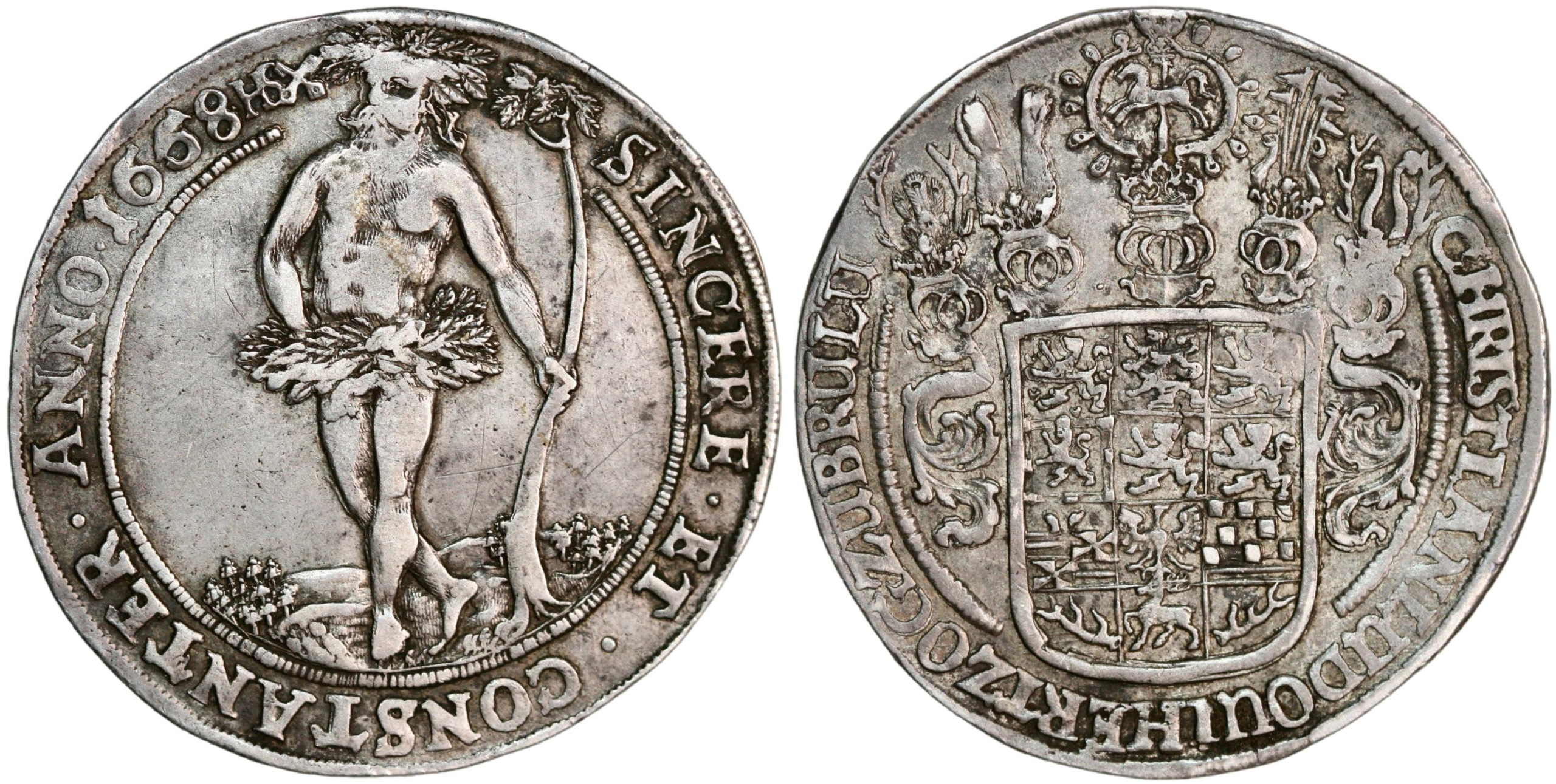 Tyskland, taler fra 1658, slått under hertug Christian Ludwig av Braunschweig-Lüneburg. Kv. 1+. Dav. 6518; KM 237. 28,9 g.