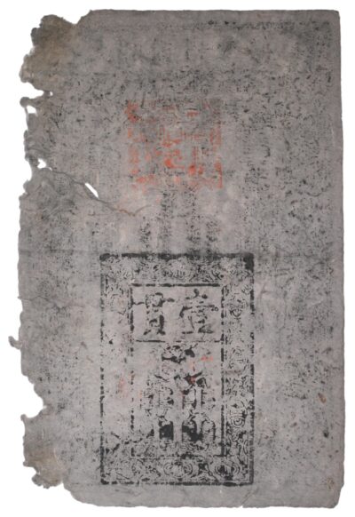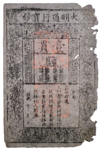 China, The Ming Dynasty (Board of Revenue), 1 Kuan (1000 Cash) dated 1368-1399. Printed on traditional mulberry bark paper and bearing the imperial Red Seal of Emperor Hung Wu. Preserved in good condition with some rifts. A remarkable example of the world’s earliest known banknote.