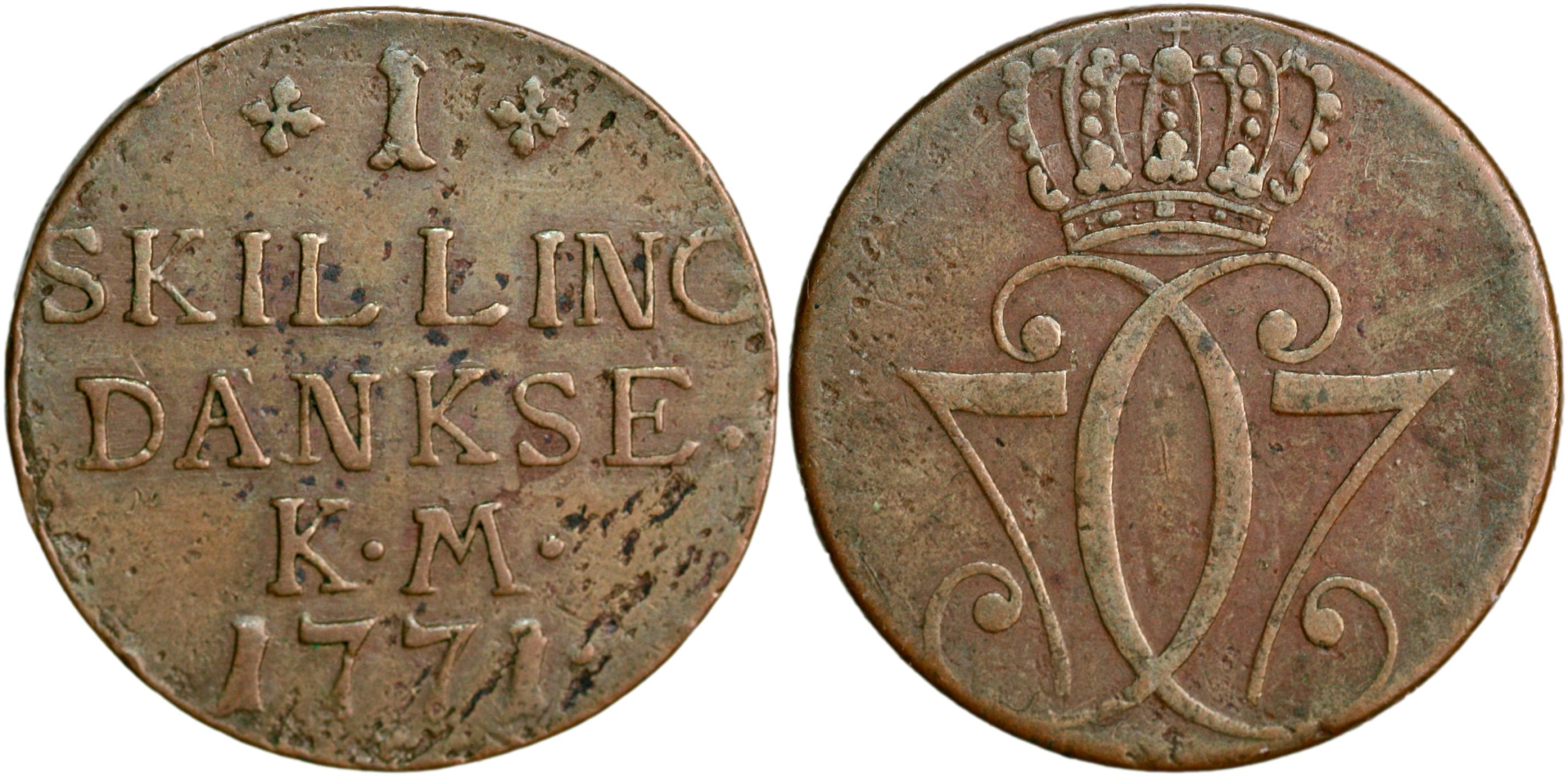 Denmark, 1 skilling DANKSE dated 1771, struck under King Christian VII. Error coin (DANKSE). Very Fine condition. S 2.4; H 37b. 10,6 g.
