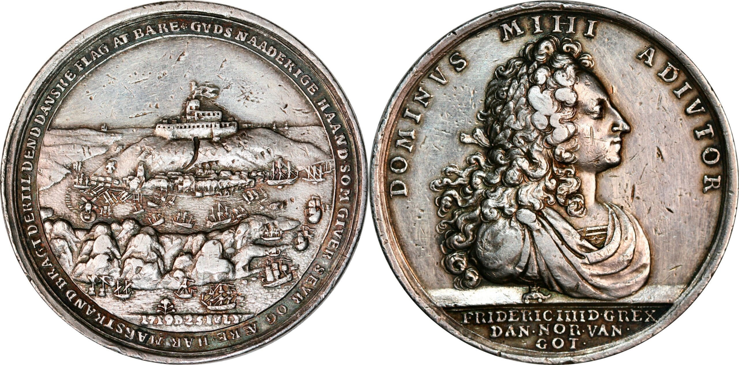Denmark, Capture of Marstrand 1719, silver medal struck under King Frederik IV. Commemorative medal marking Tordenskjold’s capture of the Swedish town of Marstrand and the fortress of Karlsten. Engraved by Christian Wineke. Very Fine condition. Some surface marks. G 279. 49 mm; 59.05 g.