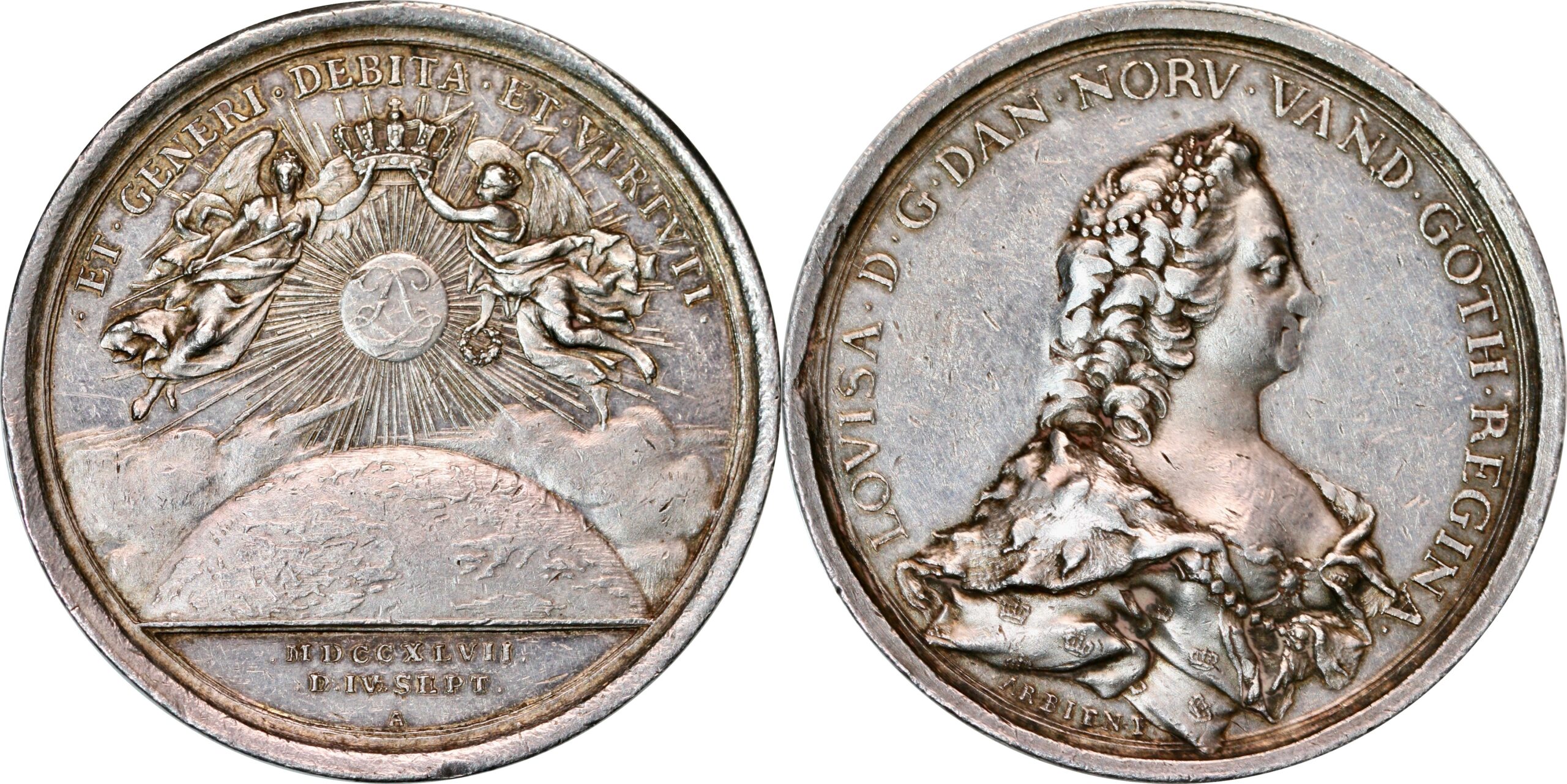 Denmark, silver medal dated 1747, struck under King Frederik V, marking the anointing of Queen Louise. Engraved by Magnus Gustav Arbien. Very Fine condition. G. 433. 50 mm; 58,55 g.