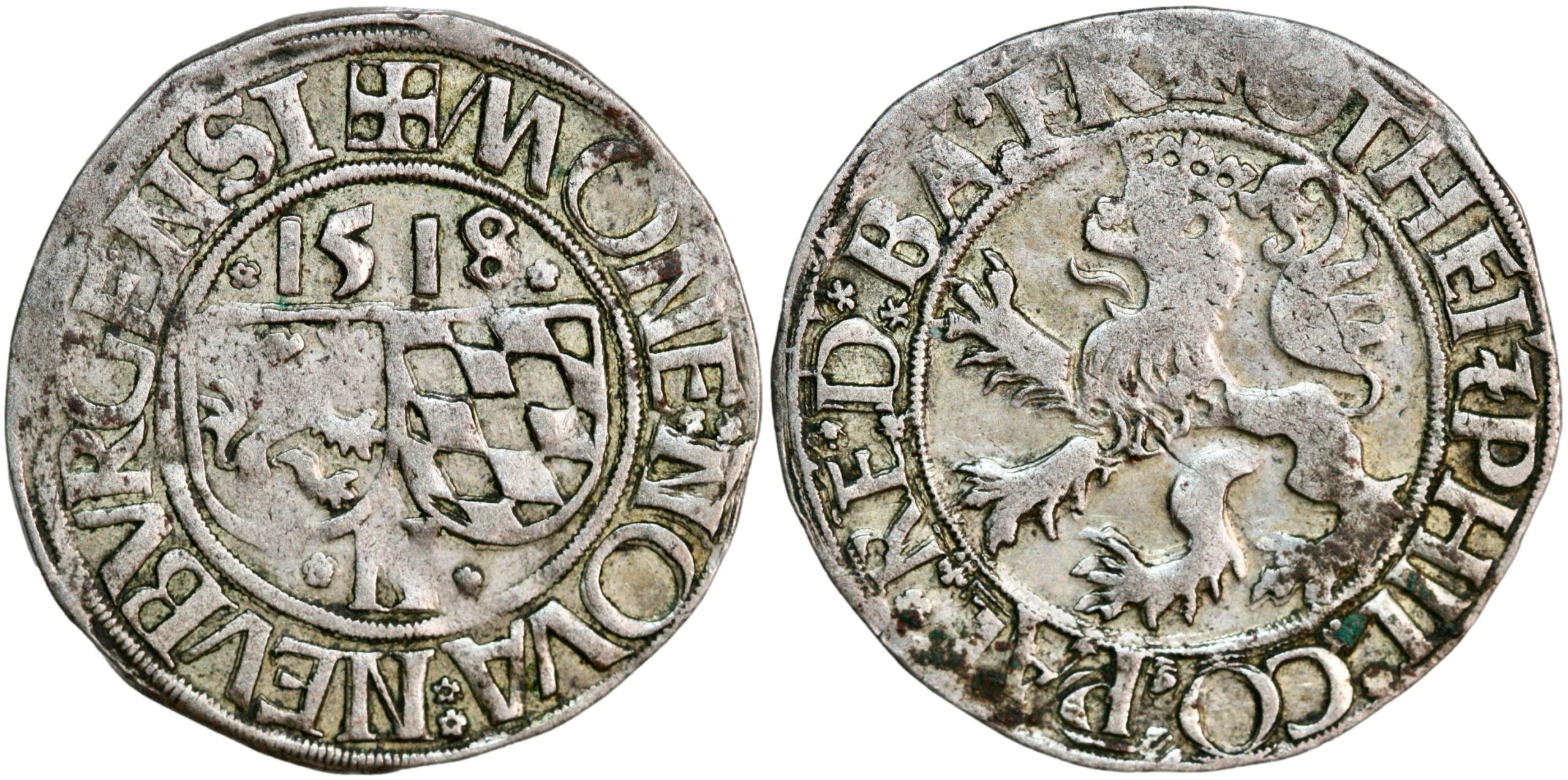 Germany, batzen dated 1518, struck under Ottheinrich and Philipp of Pfalz-Neuburg. Very Fine condition. Schulten 2757; Noss 545. 3,88 g.