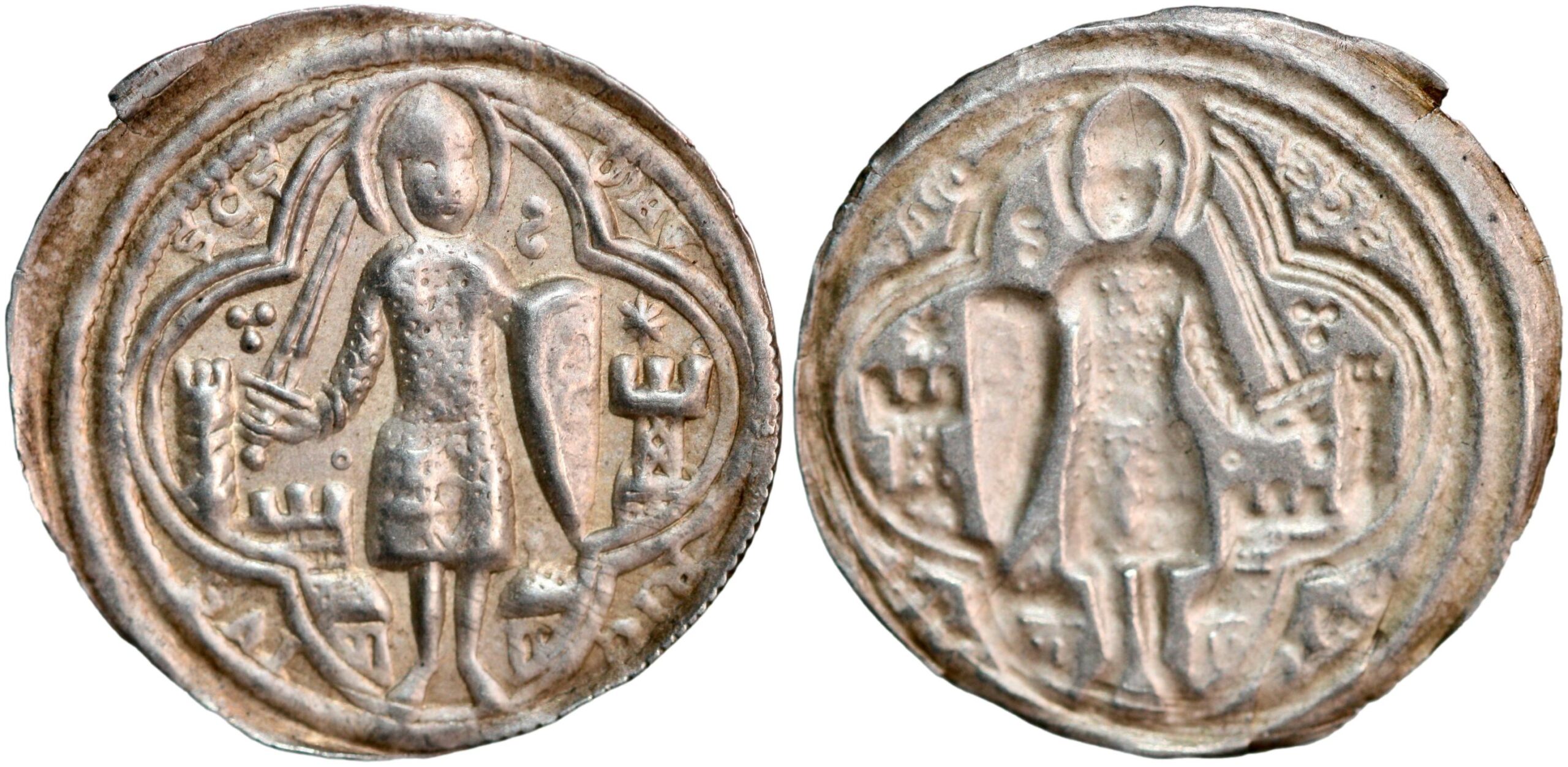 Germany, brakteat dated 1152-1192, struck under Wichmann von Seeburg, Archbishop of Magdeburg. Extremely Fine condition. Standing armored and nimbate figure of Saint Maurice, holding sword and shield and flanked by a fortified buidings to left and right. All within quatrefoil border with legend in outer fields. Four symbols or privy marks (a star and inverted S to righ, a trefoil and annullet to left) in fields. Legend: SCS MAV RIC IVS Löbbecke 302; Berger 1520; Bonhoff 653. 0,95 g.