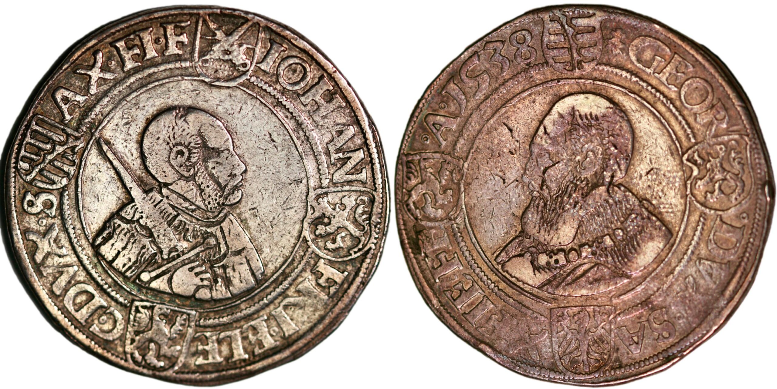 Germany, thaler dated 1638, struck under Elector Johann Friedrich I of Saxony and Georg, Duke of Saxony. Very Fine condition. Keilitz 128; Schnee 72. 28,87 g.