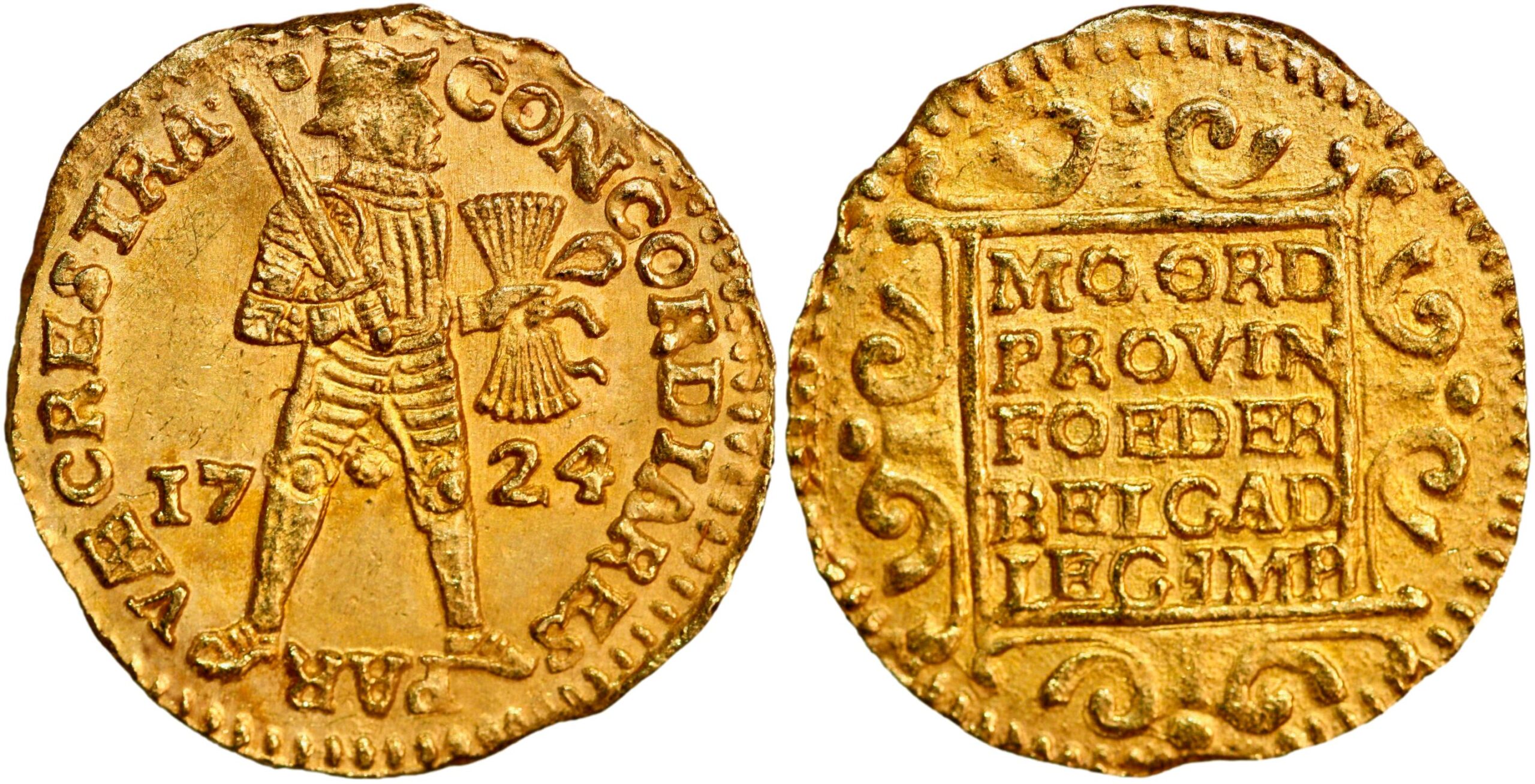 - Netherlands, Utrecht, ducat 1724 (gold). A rare coin in excellent condition, known only from the Akerendam find. Fr. 284; KM 7.1; Rønning 1. 3,47 g.