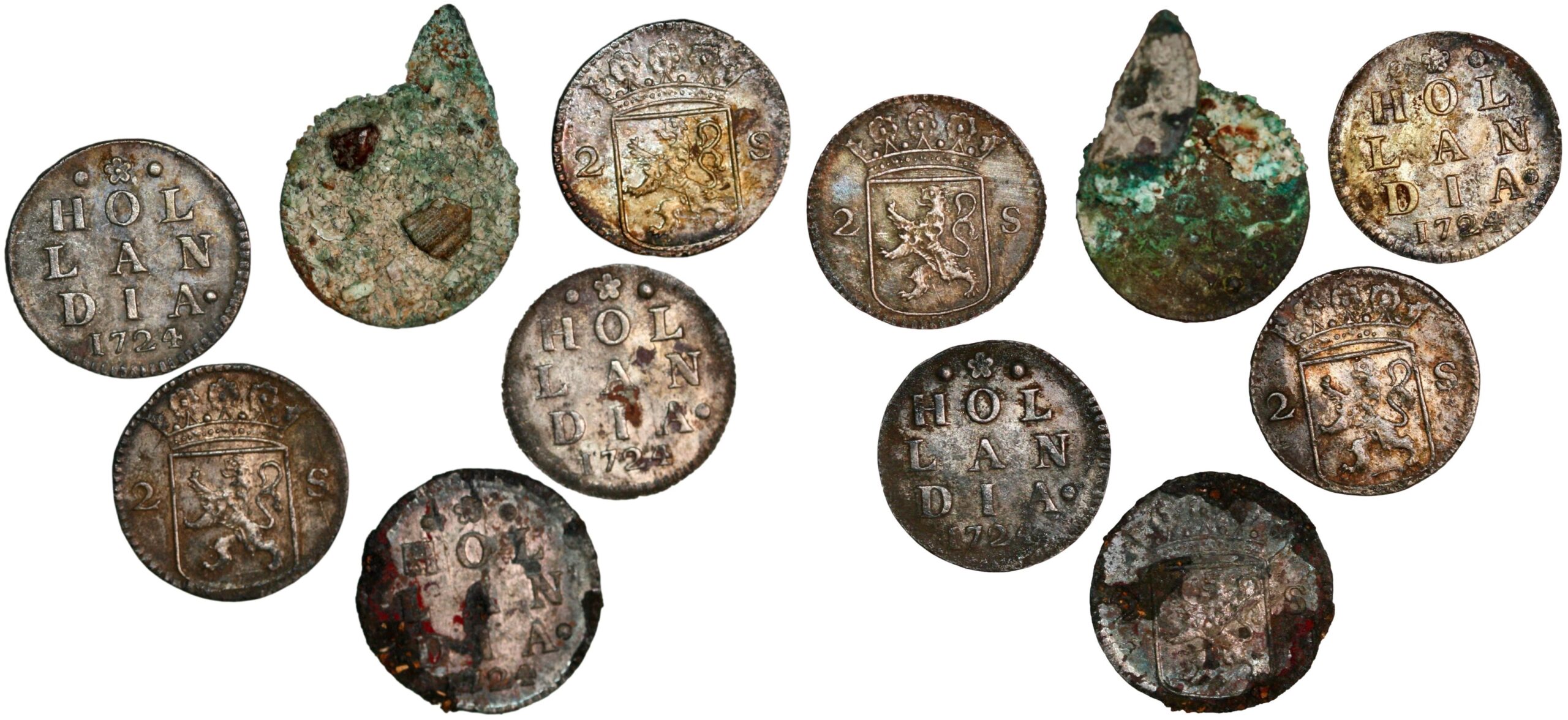 - Netherlands, Holland, 2 stuiver 1724 (six coins) – KM 48; Rønning 4. Total weight: 8,61 g.