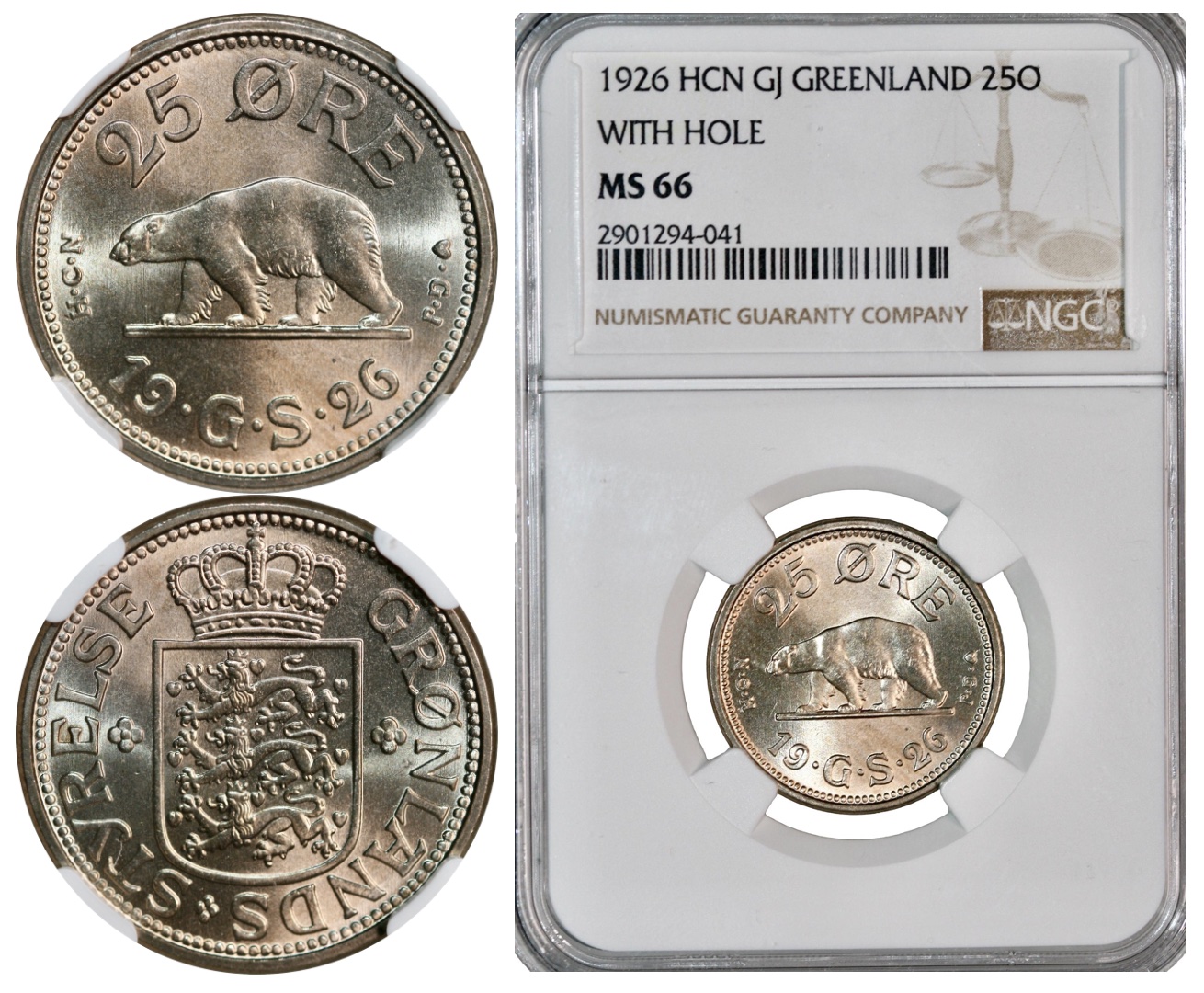 Greenland, 25 øre dated 1926. Encapsulated by Numismatic Guaranty Corporation (NGC) and graded MS 66. S 1; H 3; KM 5.