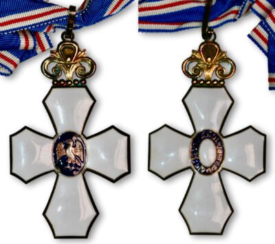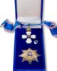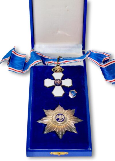 Iceland, Order of the Falcon, First Class Grand Knight. This elegant presentation case contains a silver-gilt neck badge adorned with white and blue enamel, suspended from a full-length neck ribbon in white, red, and blue. Accompanying the badge is a breast star in silver with enamel detailing, along with a matching bouton. All items are housed in their original case, and everything is in an excellent condition. No damage on the enamel.