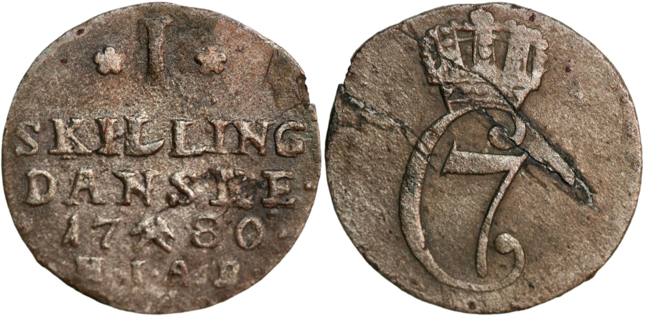 Norway, 1 skilling dated 1780, struck under King Christian VII. Fine condition. NMD 98; KM 258. 0,7 g.