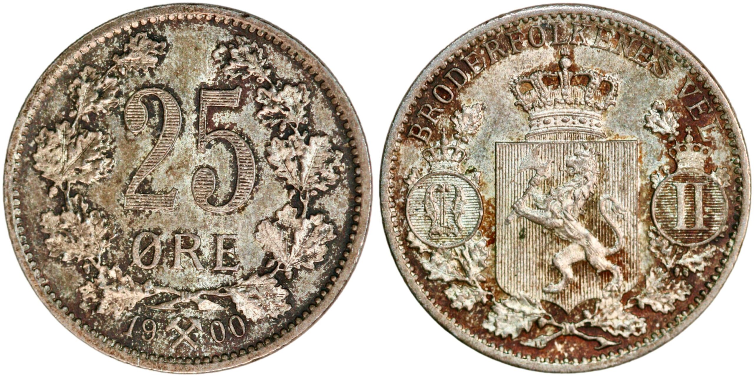 Norway, 25 øre dated 1900, struck under King Oscar II. Mint State condition. Lots of luster and beautiful patina. NMB 73; NM 72; KM 360. 2,4 g.