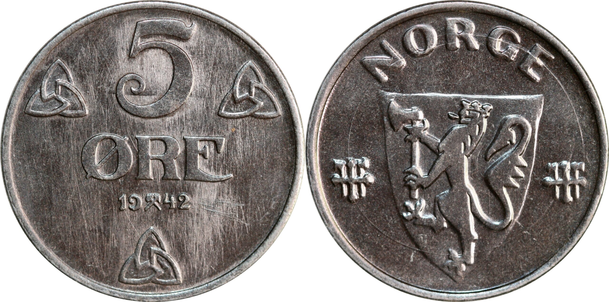 Norway, 5 øre dated 1942, struck during German occupation. Choice Mint State condition. NM 283. 7,0 g.