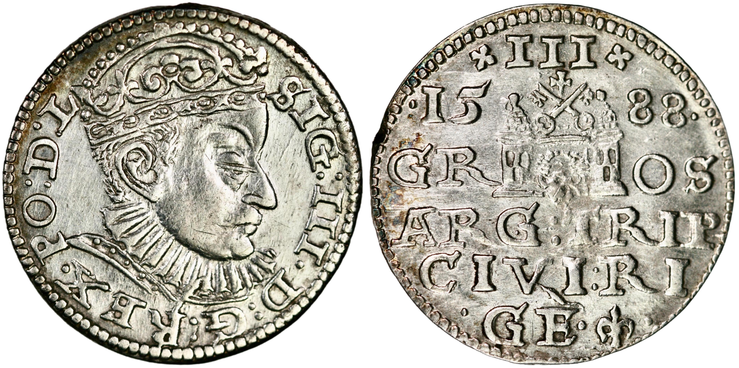 Poland, 3 groschen dated 1588, struck under King Sigismund III Wasa (also duke of Livonia) in Riga. Mint State condition. 2,43 g.