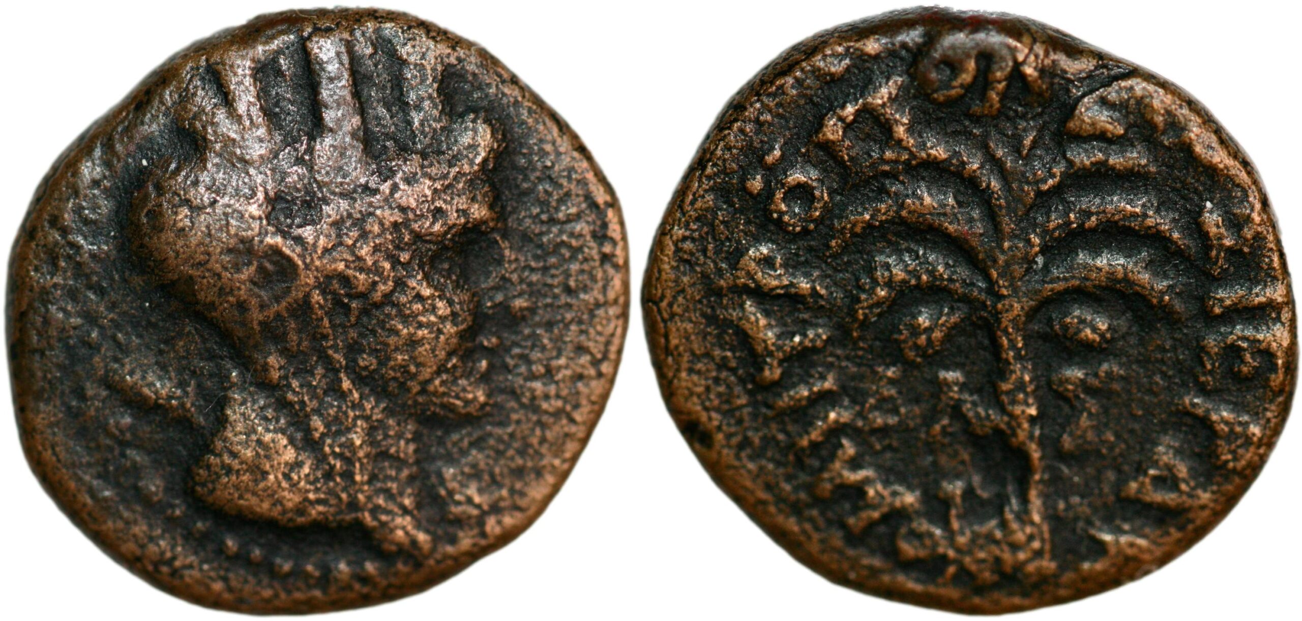 Bronze coin dated ca. 100 AD, struck under Emperor Trajan in Tyre, Phoenicia. Very Fine condition. Tyche with crown / Date palm. SNG Cop. 349. 3,51 g.